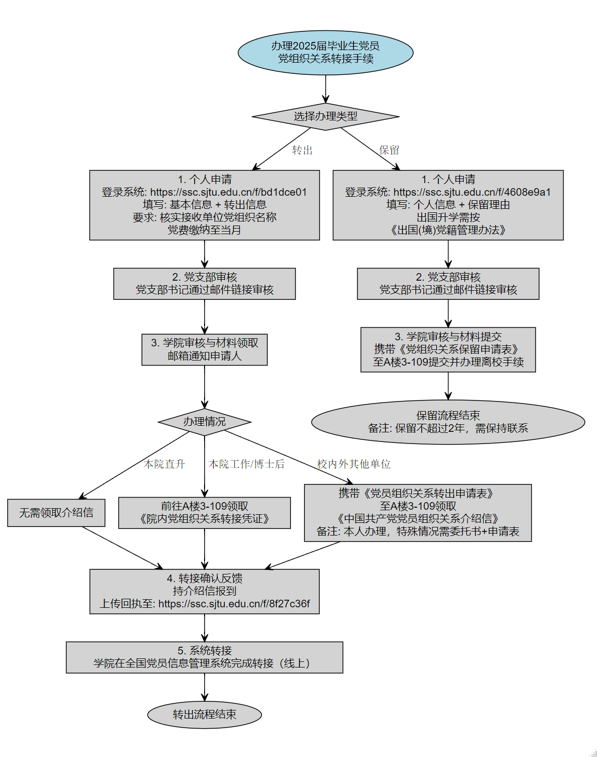 毕业生可凭《党员组织关系转出申请表》或《党组织关系保留申请表》,于周四9:00-11:30、周五14:00-17:00期间,前往农业与生物学院A楼3-109室联系于老师领取《党组织关系转接介绍信》并办理离校手续。