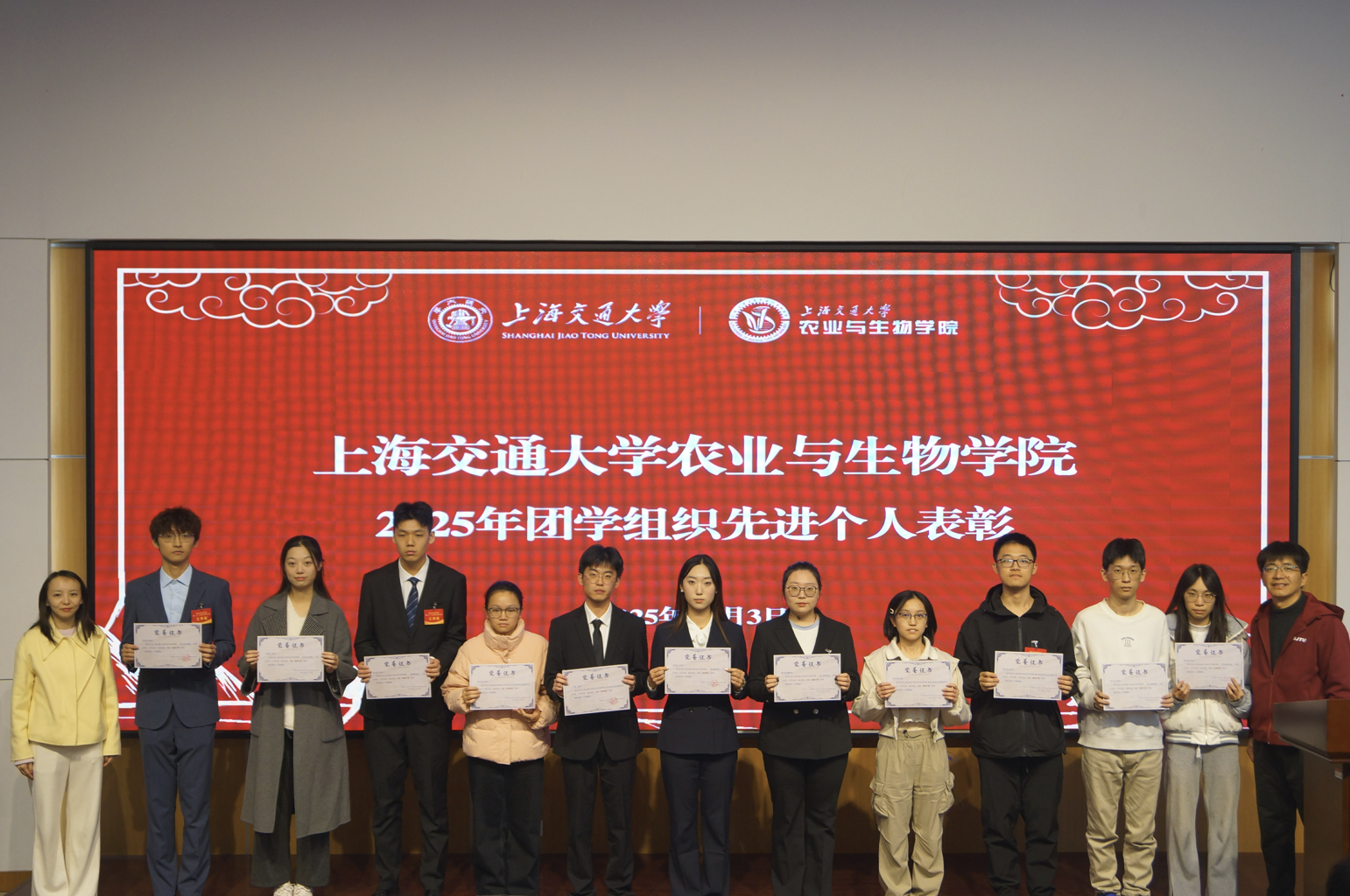 大会表彰了2025年度在学院各团学组织中工作认真扎实、作风硬朗、吃苦耐劳、为同学服务的先进个人。张仁伟、张碧菱为获奖同学代表颁奖并合影留念。